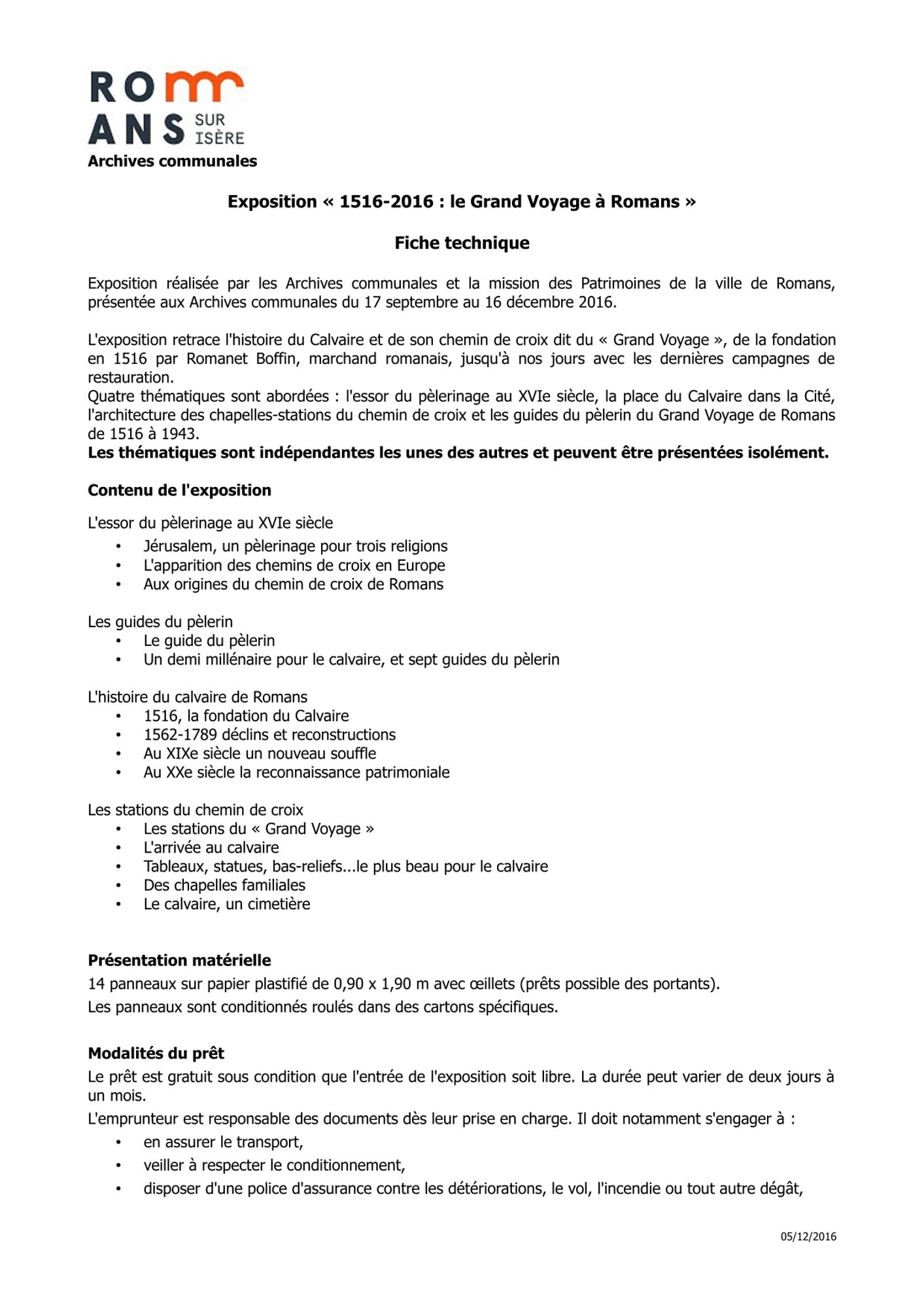 Exposition "1516-2016 : le Grand Voyage à Romans" Fiche technique (45.0 Ko) Télécharger les panneaux d'exposition (5.9 Mo)